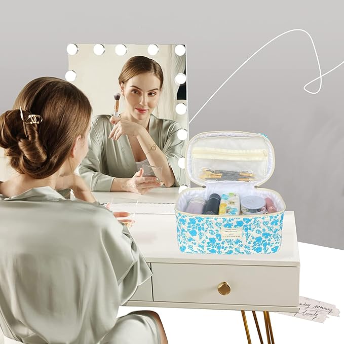 Lake Blue Large Quilted Floral Makeup Bag Cute Soft Coquette Aesthetic Cosmetic Bag Cotton Travel Toiletry Bag for Women