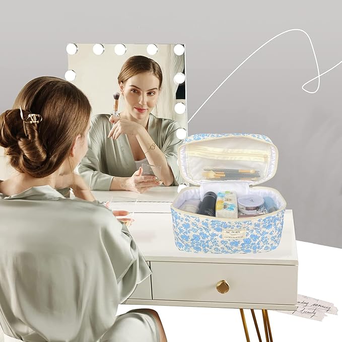 Blue Large Quilted Floral Makeup Bag Cute Soft Coquette Aesthetic Cosmetic Bag Cotton Travel Toiletry Bag for Women