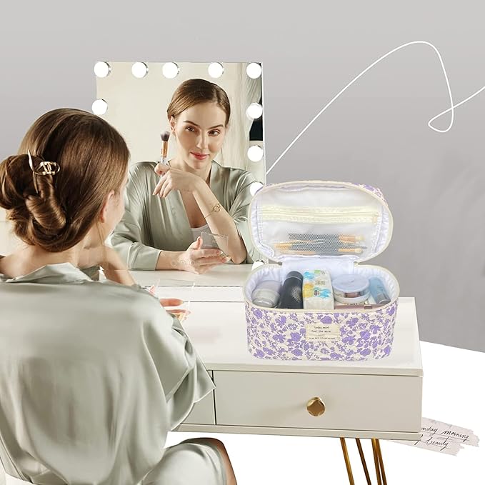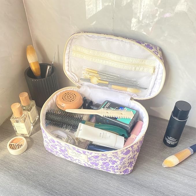 Purple Large Quilted Floral Makeup Bag Cute Soft Coquette Aesthetic Cosmetic Bag Cotton Travel Toiletry Bag for Women