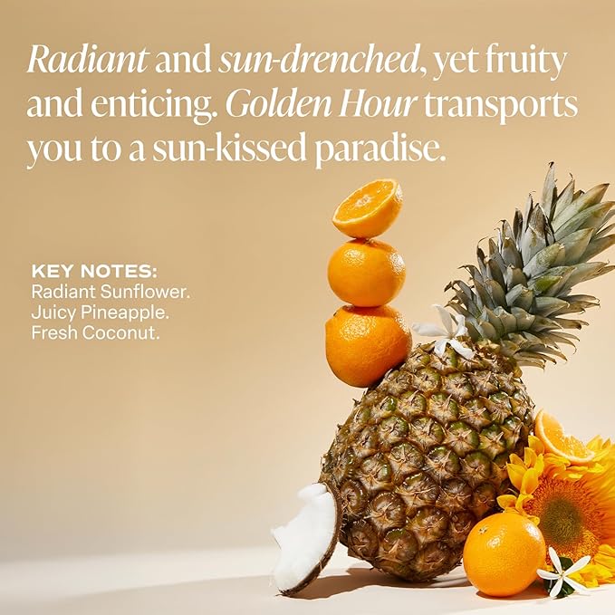 - GOLDEN HOUR FRAGRANCE: Radiant Sunflower, Juicy Pineapple, and Fresh Coconut is a bright and uplifting tropical blend, bursting with sunny florals, luscious fruit, and creamy, beachy warmth. Sun-drenched and enticing, Golden Hour transports you to a sun-kissed paradise.