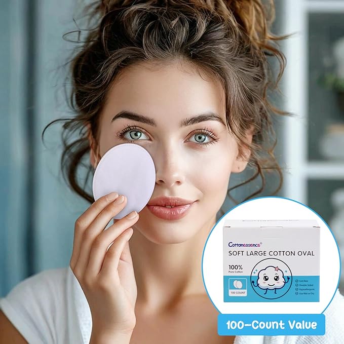 Oval Cotton Pads (100-Count)- 100% Pure Cotton, Gentle Enough for Babies, Soft Texture, Large Size, Lint-Free, Double Sided, Hypoallergenic, Use Wet or Dry