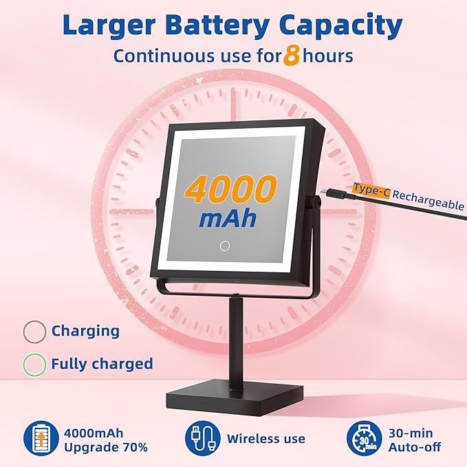 - [High Capacity Battery] Our Bathroom makeup mirror features a 4000mAh battery, providing up to 8 hours of continuous use