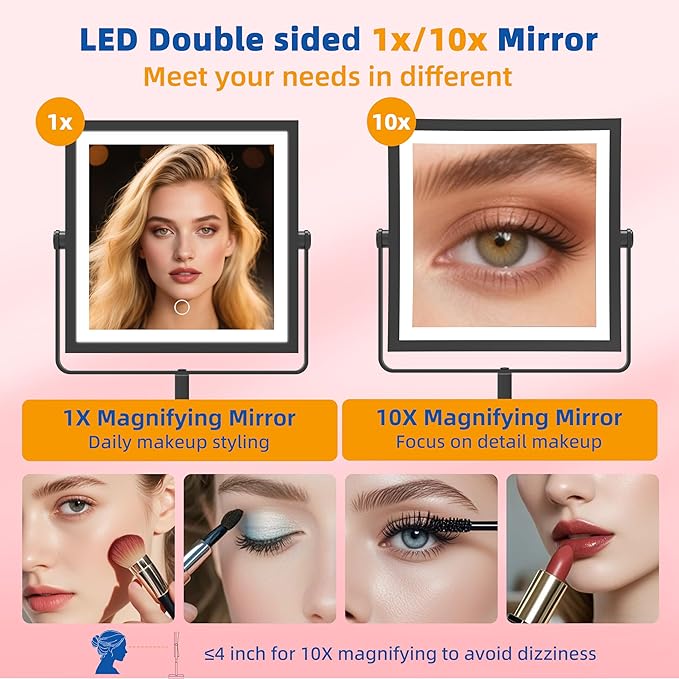 - [1X/10X Double Sided Magnifying Mirror] This led mirror for bathroom’s 1X vanity mirror is used for overall makeup and daily skincare, the 10X magnifying makeup mirror is suitable for applying eye makeup, lipstick, etc