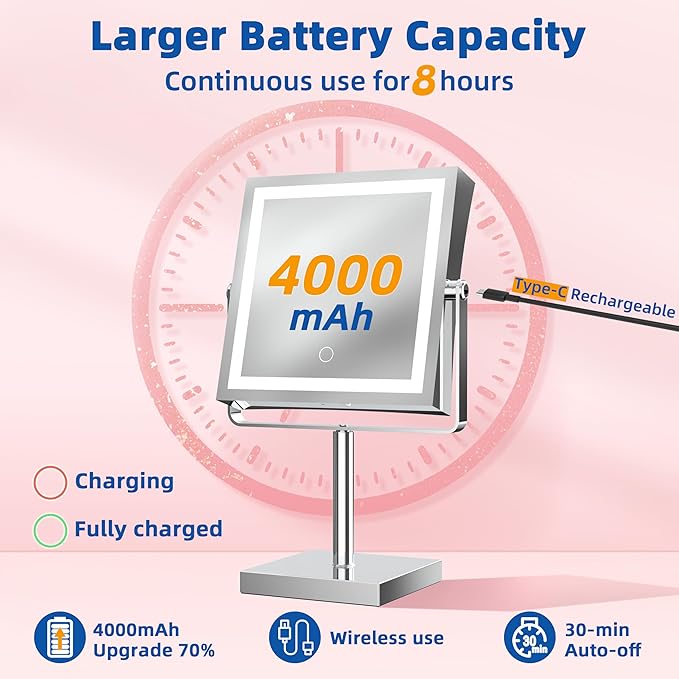 - [High Capacity Battery] Our Bathroom makeup mirror features a 4000mAh battery, providing up to 8 hours of continuous use