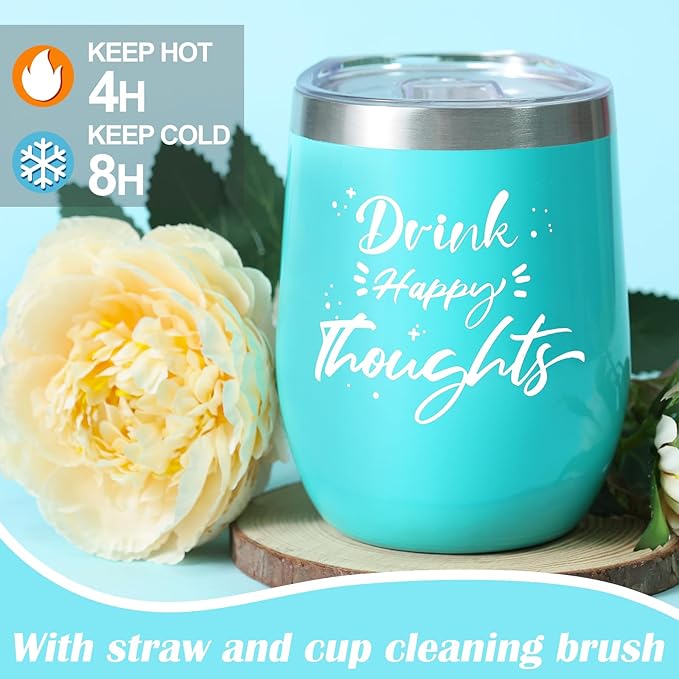 - COOLING AND HEAT PRESERVATION INSULATED VACUUM TUMBLER: Made of food-grade sturdy stainless steel, with double-walled vacuum insulation, this sweat-free 12oz insulated tumbler with lid can preserve beverage temperature up to 8h for cold & 4h for hot, great for iced coffee, tea, wine, juice, champagne, smoothies, sodas, milkshake, etc; "Drink Happy Thoughts", energetic quote brighten her days and make her smile when she enjoy her beverage, making it an ideal relaxation gifts for her friendship gifts for women.