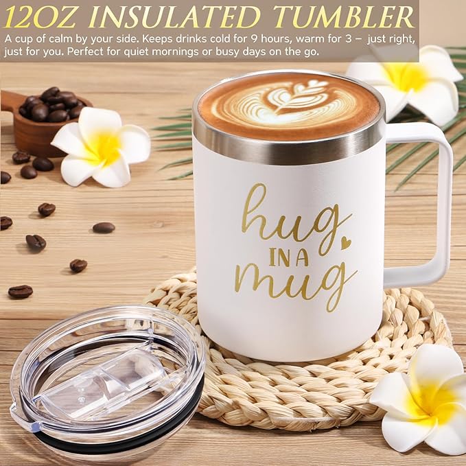 - INSULATED TUMBLER WITH HANDLE: Made of BPA-free premium 18/8 food-grade stainless steel with a double-wall vacuum insulated design, this 12oz tumbler with handle can keep drinks cold for up to 9 hours & hot for up to 3. “Hug in a Mug” - A cozy reminder that you're never alone. Whether it's a sip of tea or a moment of calm, this tumbler wraps your heart in warmth—just like a hug should. Perfect as thank you gifts cheer up gifts birthday Christmas gifts for mom sister best friends wife girlfriend