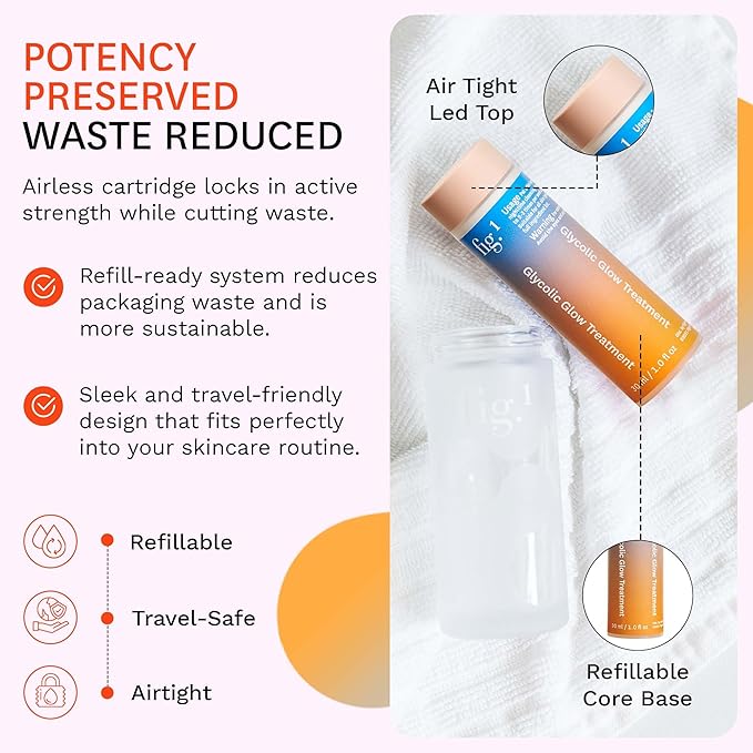 - Refill Cartridge – Outer Glass, Cap and Airless Pump Not Included This is a refill cartridge intended for use with your existing Fig.1 Glycolic Glow Treatment 30 ml outer glass, cap, and airless pump. This is only a refill and is designed to reduce waste while delivering the same high-performance formula.