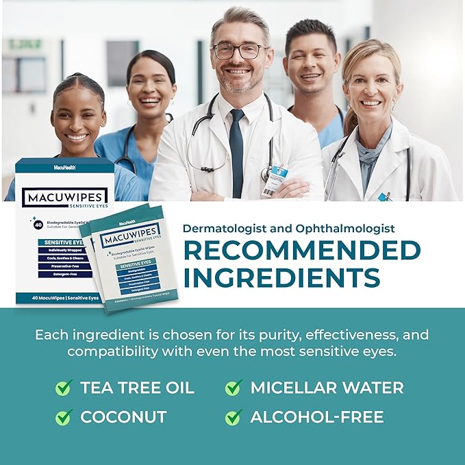 - GENTLE EYELID WIPES FOR SENSITIVE EYES: MacuHealth MacuWipes Tea Tree offer a gentle solution for dry, sore, or gritty eyes. These pre-moistened wipes hydrate and cleanse the eye area, reducing irritation from prolonged screen use or environmental factors.