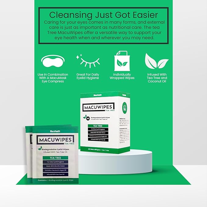 - GENTLE EYELID WIPES FOR SENSITIVE EYES: MacuHealth MacuWipes Tea Tree offer a gentle solution for dry, sore, or gritty eyes. These pre-moistened wipes hydrate and cleanse the eye area, reducing irritation from prolonged screen use or environmental factors.