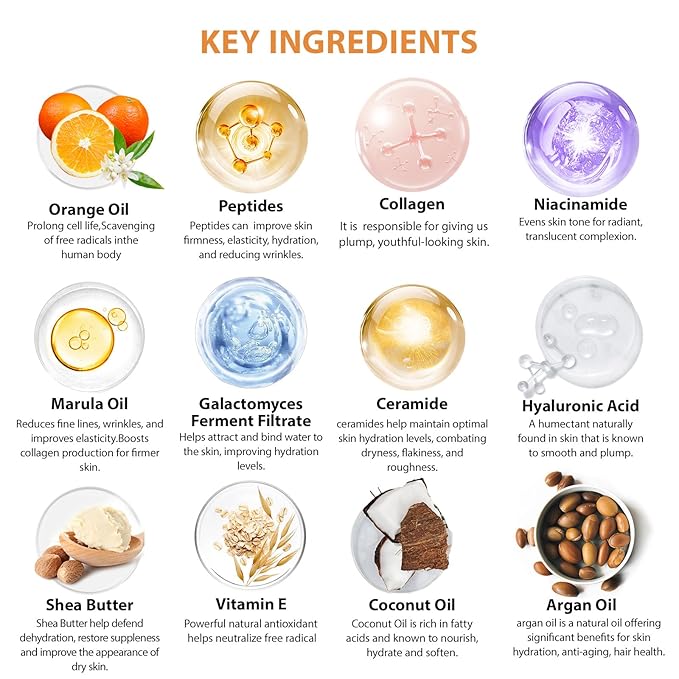 - 33 Pcs Advanced Skin Care & Spa Basket: This gift contains orange essential oil products with 100ml face gel cleanser, 30ml hand cream, 120ml face cream, 2 pcs sheet face mask, 2 pcs hydrolyzed real collagen mask, 3 pcs gel under patches, 3 pcs gel lip mask, 30ml clay mask, 30ml orange face serum, 15ml rose face serum, 15ml ylang ylang face serum, 15ml lavender face serum, gua sha, face sponge, 150g bath bombs, lip gloss, silk sleep mask, spa headband, bath puff, fuzzy sock, silk hair tie, earlugs, eyebrow razor, necklace, perfume packaged in a nice beautiful luxury leather cosmetic bag