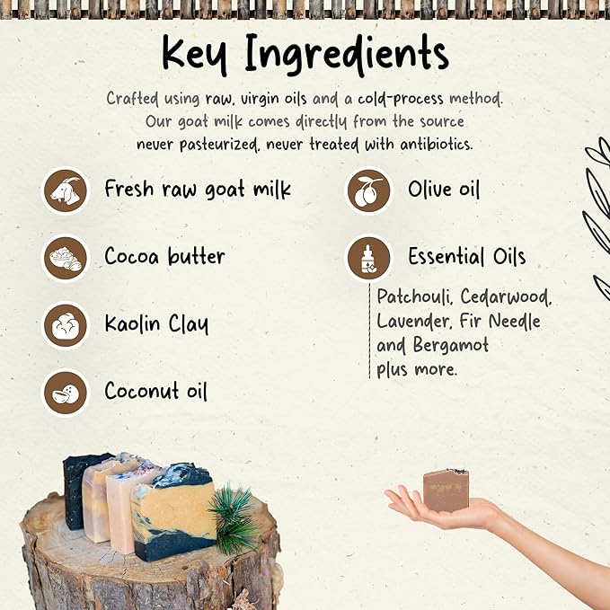 - RUSTIC OUTDOOR-INSPIRED SCENT: The Mountain goat milk hand soap features a rugged, masculine blend of patchouli, cedarwood, lavender, fir needle, and bergamot essential oils—evoking the fresh, earthy scent of a serene mountain trail ride.
