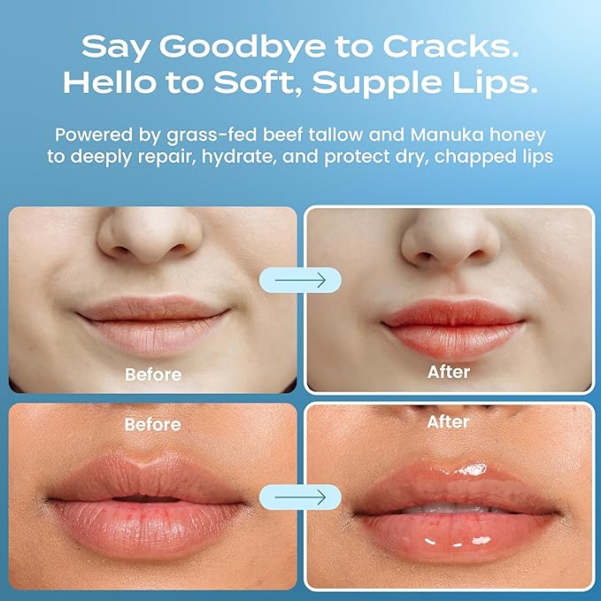 - Beef Tallow Moisturizer & Nourishment: Our beef tallow moisturizer locks in hydration and helps maintain soft, supple lips day and night.