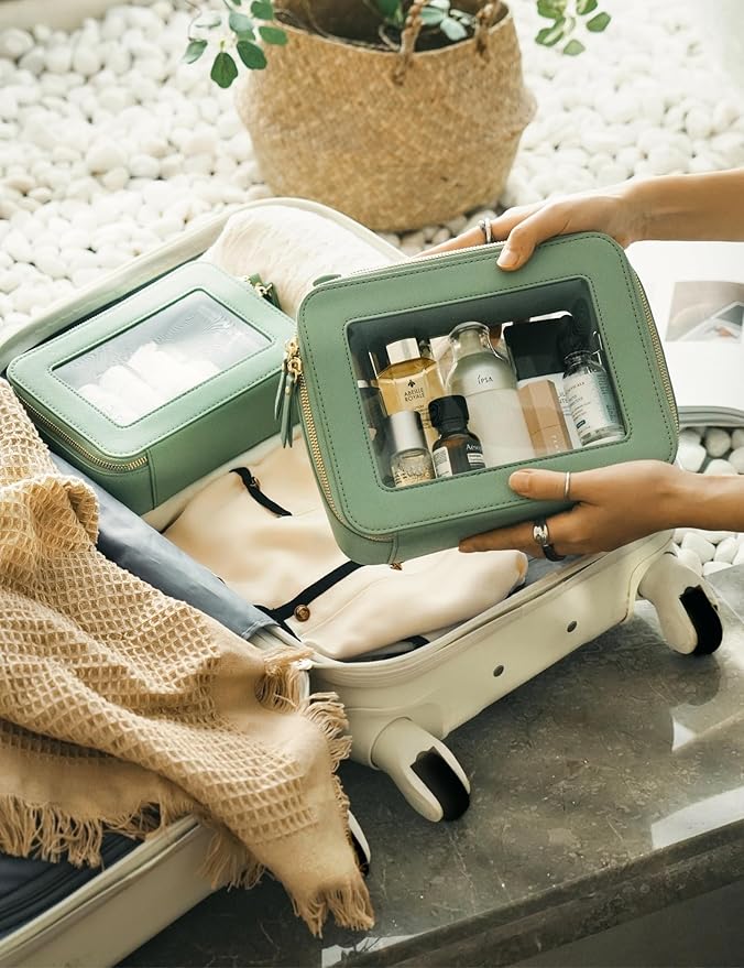 - [Spacious and Roomy] – The green travel make up bag measures 9.6'' x 7.5'' x 3.1'' (24.5cm x 19cm x 8cm), ideal for extended trips or situations where you need to carry a comprehensive collection of makeup and skincare products. It is designed to fit comfortably in suitcases and big travel bags.