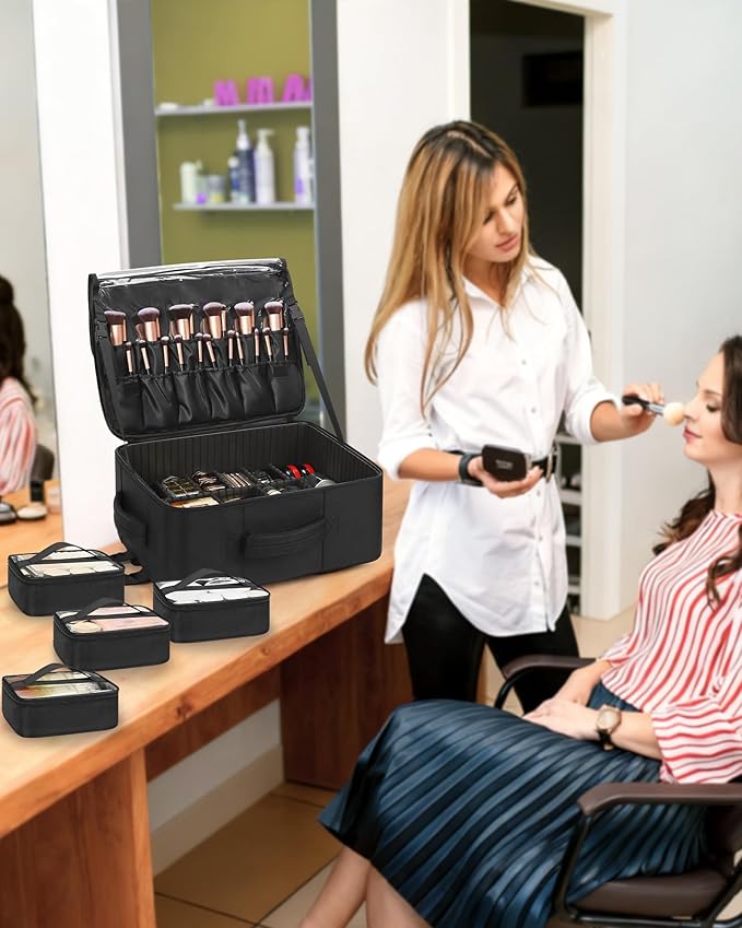 - Customizable Interior: Equipped with 10 adjustable dividers, the main compartment offers multiple layout options. Customize the space to suit your needs—whether for bottles, foundation, palettes, or other items. The dedicated brush section holds up to 50-60 makeup brushes.