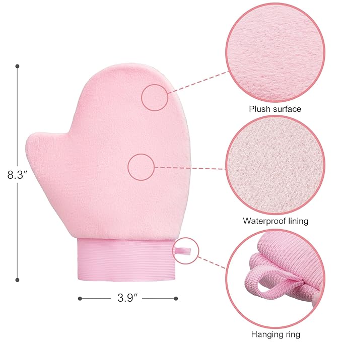- 【Sunless Tanning Mitt】8.3×6.3 IN. This full-body self tanner glove is made of a soft, vegan-friendly flocking surface and a waterproof & oil-resistant PE film lining, perfect for self tanning / sunscreen / body lotion application and blending. Note: Rinse and clean after use, and dry in a well-ventilated area.