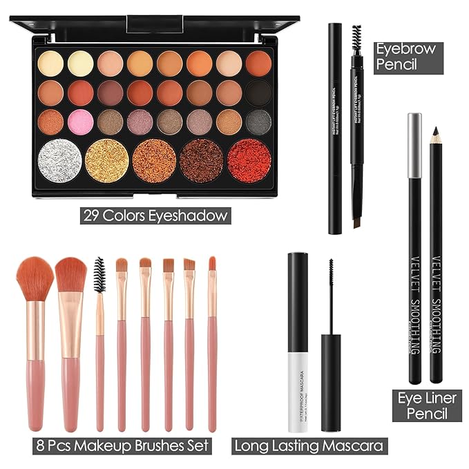 - Makeup Eye Set: The makeup set includes an eyeshadow palette with 29 shades, 8 makeup brushes, mascara, eyebrow pencil and eyeliner to meet the basic makeup tools for eye makeup. The eyeshadow palette can depict a variety of makeup effects such as matte eye makeup and shimmering eye makeup, this beauty set can meet your needs to create a natural three-dimensional eye makeup.