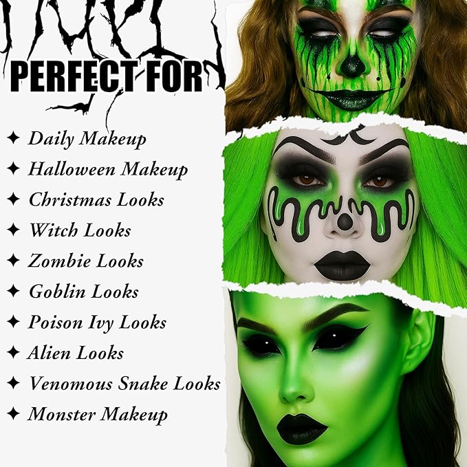 - EYESHADOW & FOUNDATION- This richly pigmented eyeshadow with matte, shimmer, and glitter shades in vivid lime, emerald, olive, forest green, and gold tones. Perfect for creating fantasy-inspired makeup looks like wicked witches, forest spirits, alien glam. This full-coverage foundation designed to deliver a true white base, offers smooth, opaque coverage that works as a perfect blank canvas for any Halloween makeup looks. Lightweight and blends evenly without streaking or cracking, provide costume-grade white skin effect.