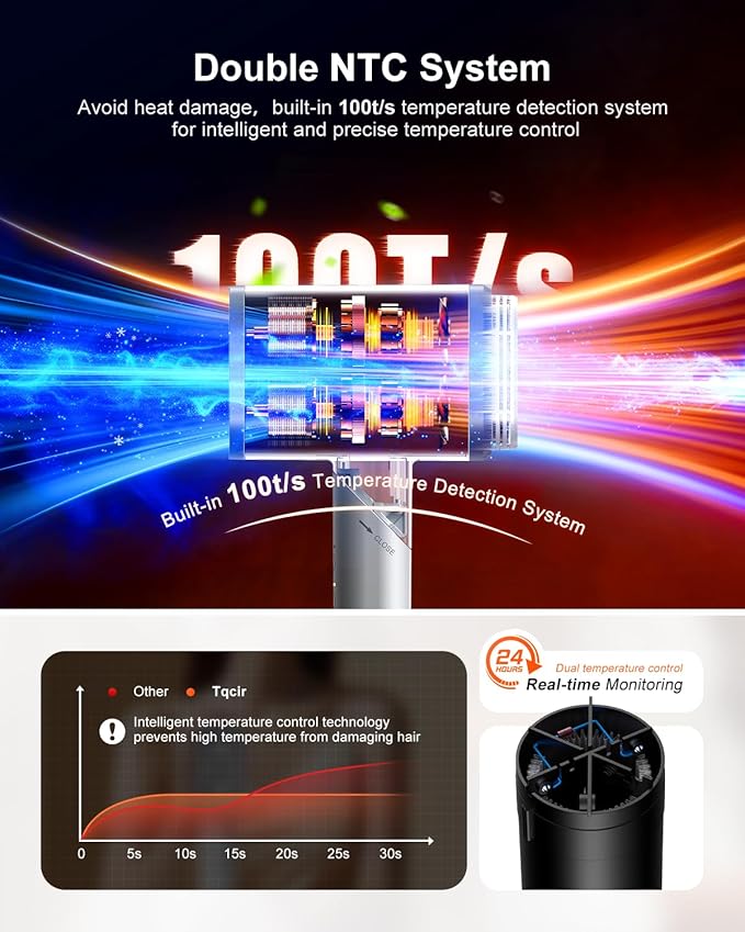 - 220,000 RPM Dual High-Speed Motors---New concept dual-motor high speed hair dryer which built in two 110,000 brushless motors generates ultra-fast airflow up to 38m/s. Redefined the hair-drying efficiency, 6X powerful airflow than traditional and single motor hair dryers.Tqcir dual-motor high speed hair dryer can dry short hair in just 1 minute, medium-length hair in 2 minutes, and long hair in only 3 minutes