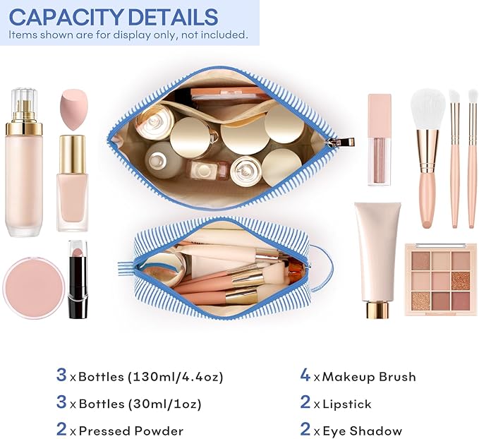 - 2 Pack:Available in two compact sizes, 11.02" x 3.35" x 7.48" and 8.5" x 2.56" x 3.54", can hold everything according to the size of your makeup and skincare stuff. these cosmetic bags are easy to carry and slightly larger than the palm of your hand, ensuring durability and portability. Great travel gifts for women