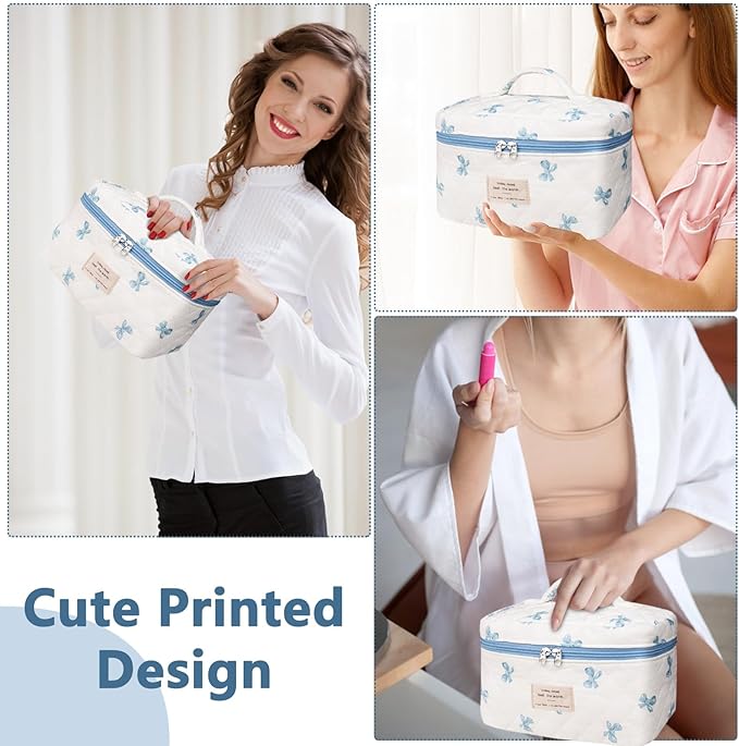 Large Makeup Bag, Cute Cosmetic Bag for Women Girls, Floral Coquette Aesthetic Toiletry Bag, Travel Make Up Organizer Bag (White Blue Butterfly Flower)