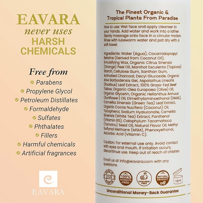 - Made in USA & Trusted Since 2014 - Formulated in Hawaii, this botanical skincare formula is a clean beauty essential you can feel good about. Eavara’s unique blend of organic ingredients delivers healthy-looking skin with none of the junk. Suitable for all skin types and ideal for those seeking a hydration-focused botanical cleanser.
