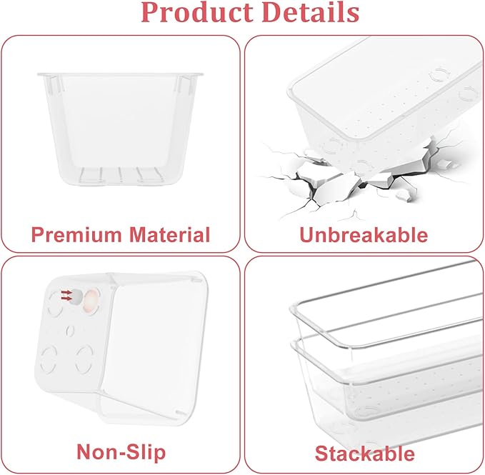 - Premium Shatter-Resistant Material: Constructed from high-impact transparent plastic, these drawer organizers resist cracks and wear for long-lasting use. The clear design allows quick visibility of contents, eliminating messy searches