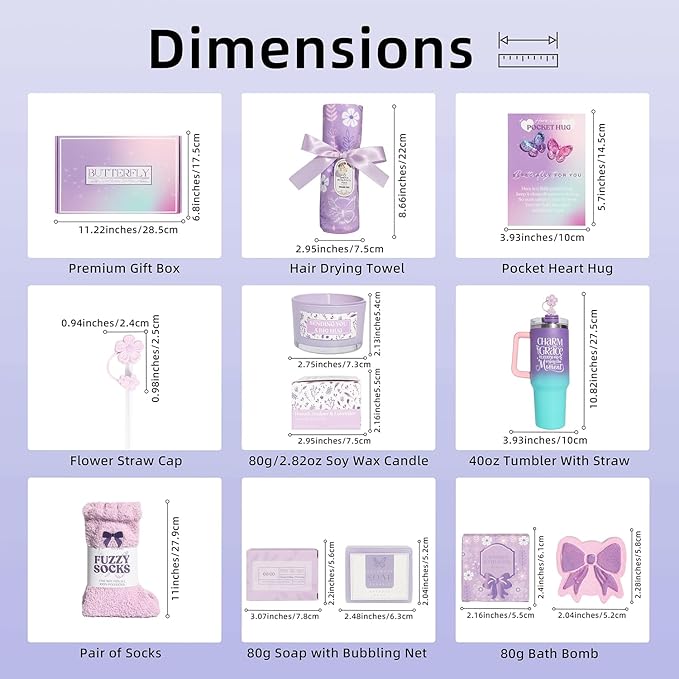 - 【9PCS Care Package for Women】:The get well gifts sympathy gift basket spa birthday gift set for women is the ultimate way to make her feel cherished. It is a luxurious and thoughtful collection, including 40oz insulated tumbler with straw, floral straw cap, 40*60cm butterfly hair-drying towel, 2.82oz juniper & lavender candle, 120g purple lavender soap, bow tie bath salt ball, bow tie fuzzy socks, pocket love card, elegant gift box. Flowers will wilt and food will be eaten, but the items in the care set will always be with her, serving as a lasting reminder that you care about her