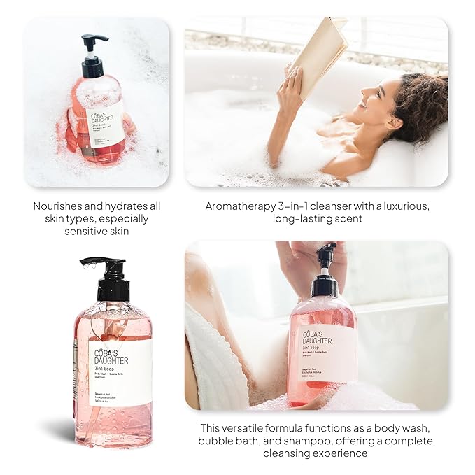 - Spa-inspired trio, crafted for daily versatility: Whether it’s a morning refresh or an evening soak, our 3-in-1 soap trio brings versatility to your routine. Use as hand wash, body wash, or bubble bath. Paired with a soft-textured loofah, each use offers a calm and comforting cleanse.