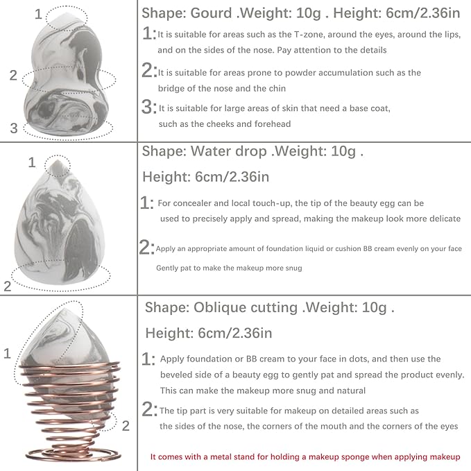 - Three shaped makeup sponges and a metal stand It can be used in the T-zone, around the eyes, on the chin, on the bridge of the nose and for base makeup, covering all aspects. The metal stand is used for changing tools and placing sponges during makeup