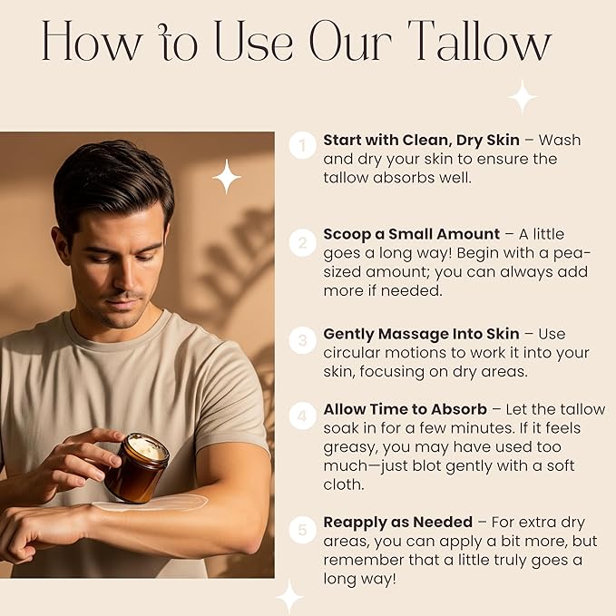 - ⭐ Beef Tallow is rich in fatty acids that closely resemble the skin's natural oils, it helps lock in moisture. Contains vitamins A, D, E & K which help support skin health. Absorbs easily without clogging pores. Reduces the appearance of fine lines and wrinkles.