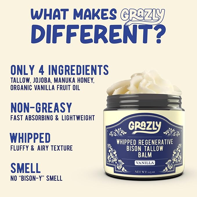 - IDEAL FOR VARIOUS SKIN TYPES: Grazly’s Whipped Bison Tallow Balm is ideal for various skin types, including those with irritation from eczema, rosacea, or sensitivity. The manuka honey and nutrient-rich bison tallow help reduce redness, soothe irritation, and balance moisture. This gentle, non-comedogenic balm nourishes the skin without clogging pores.