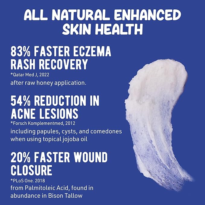 - CLEAN & SIMPLE INGREDIENTS: Made with grass-fed bison tallow, raw Manuka honey, organic jojoba oil, and a touch of organic vanilla scent, this improved formula offers a nourishing solution for moisturizing your skin. It’s ideal for sensitive skin. Available in 2.5 ounce jars, each lasting up to 3 months with daily use, it provides gentle, non-greasy hydration for a soft, smooth feel.