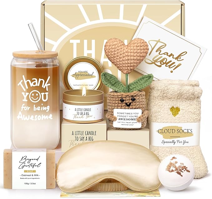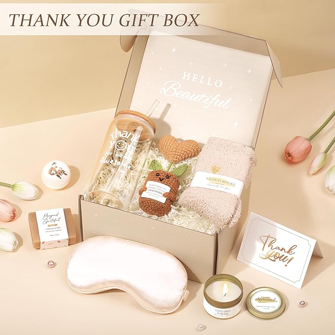 - APPRECIATION GIFTS FOR WOMEN: A thoughtful gift for those you appreciate, say 'thank you' with our gratitude deluxe gift box. When she opens this gift box, she will be filled with joy. This gratitude gift includes all 9 gifts: 1* 16oz glass cup, 1* handmade woven heart-shaped potted plant, 1*lavender soy wax scented candle, 1* handmade bar soap, 1* bath bomb, 1*silk eye mask, 1* pair of soft fuzzy socks, 1* gift card, 1* gift box.