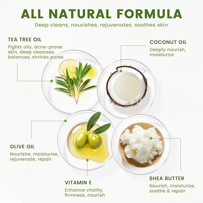 - Premium Ingredients: Cold process tea tree soap bar made with Shea Butter and Vitamin E, offering 3.5 oz of large capacity for daily use and travel. Contains Vitamin E, Coco Butryospermum Parkii, Olea Europaea, and Helianthus Annuus to lock in hydration and reduce wrinkles. Ideal for problematic skin, the qualities of Tea Tree oil help to calm irritation and target blemishes. This gentle yet effective tea tree bar soap assists in promoting a clearer, smoother complexion with every use, making it a perfect addition to your daily skincare routine