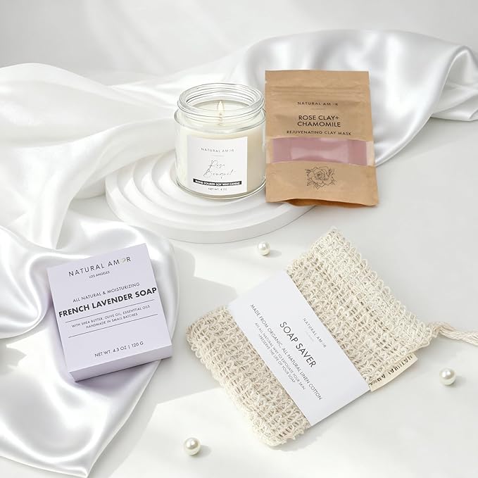 - Complete Spa Gift Set: Includes 8 curated items – pink ribbon blanket, rose clay mask, goat milk soap, rose-scented candle, bath bomb, bath salt, soap saver, and pink knit headband.
