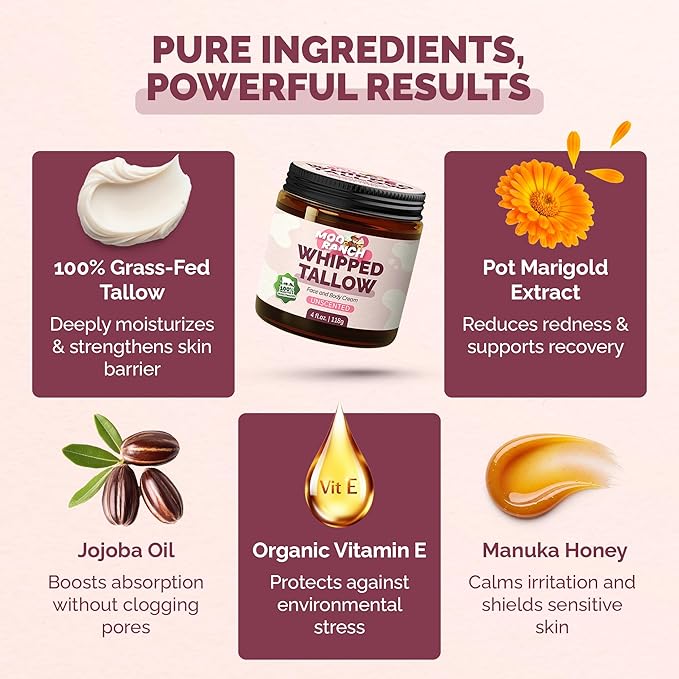 - 🌱【No Synthetic Ingredients】Free from parabens, synthetic fragrances, preservatives, and fillers, our organic beef tallow for skin have just pure, clean ingredients blended in small batches in the USA.