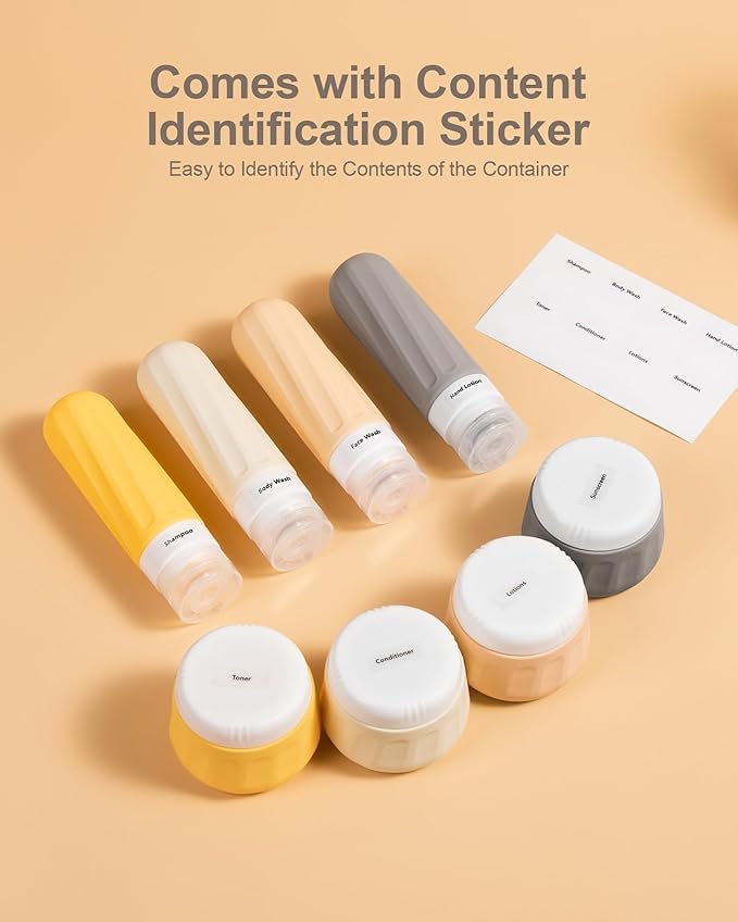 - Travel Size Toiletries: Set includes 4 silicone squeeze bottles 3oz(90ml) and 4 silicone cream jars 3oz(90ml) and clear make-up bag 6.46x2.87x5.31inch. Contents identification label sticker included