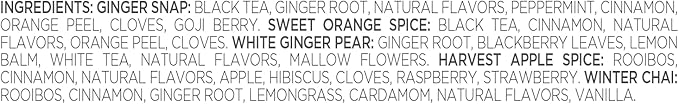 - TEA BLENDS - Ginger Snap (black - caffeinated), Sweet Orange Spice (black - caffeinated), White Ginger Pear (white - caffeinated), Harvest Apple Spice (herbal - caffeine free), and Winter Chai (herbal - caffeine free).
