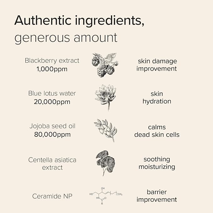 - ENRICHED WITH NATURAL EXTRACTS: Infused with 1,000 ppm of blackberry extract rich in anthocyanins, 80,000 ppm of jojoba seed oil to strengthen the skin barrier, and blue lotus water for improved skin elasticity. This essence is fortified with ceramide NP to enhance your skin's protective barrier, ensuring lasting hydration and resilience.
