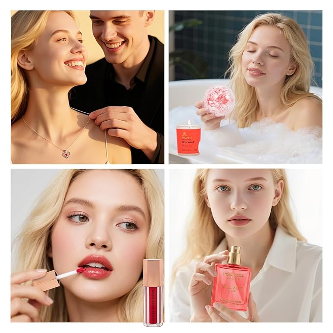 - 33 Pcs Advanced Skin Care & Spa Basket: This gift contains premium rose essential oil products with 100ml face cleanser, 30ml hand cream, 120ml face cream, 2 pcs sheet face mask, 2 pcs hydrolyzed real collagen mask, 3 pcs gel under patches, 3 pcs gel lip mask, 30ml clay mask, 30ml rose face serum, 15ml orange face serum, 15ml ylang face serum, 15ml lavender face serum, gua sha, face clean sponge, 150g bath bombs, lip gloss, silk sleep mask, spa headband, bath puff, fuzzy sock, silk hair tie, earlugs, eyebrow razor, necklace, perfume packaged in a nice beautiful luxury leather cosmetic bag