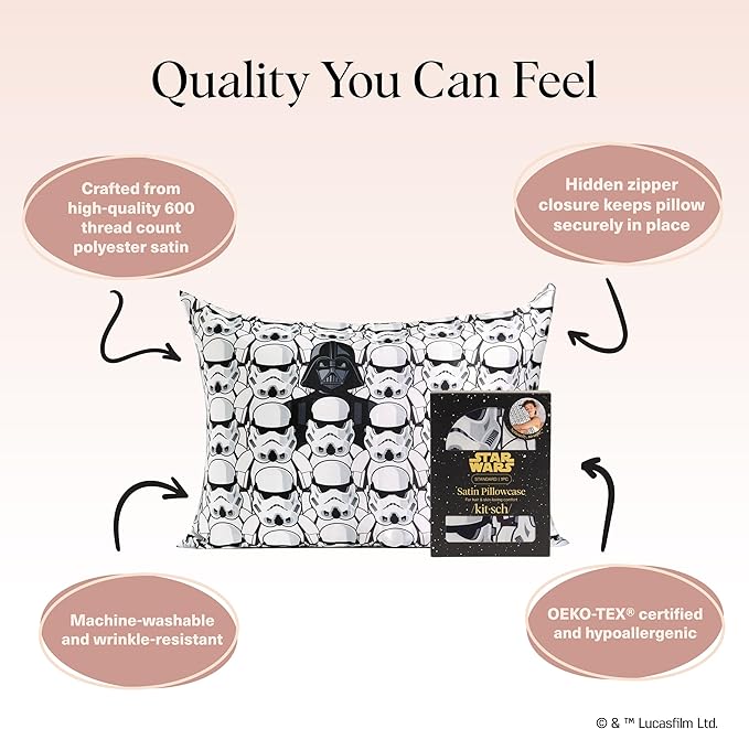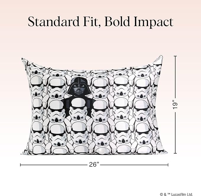 - LUXURIOUS STAR WARS SATIN PILLOWCASE – Say hello to smoother nights with the limited-edition Kitsch x Star Wars satin pillowcase, featuring Darth Vader & Stormtroopers. This luxe design blends fandom flair with beauty sleep essentials, making it more than just a pillow case—it’s a collectible and a perfect stocking stuffers for any Star Wars fan.