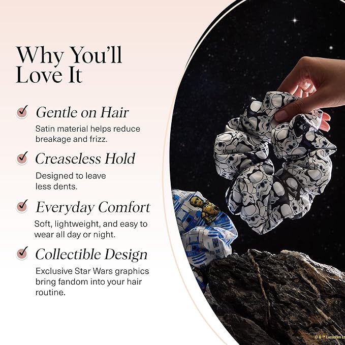 - LIMITED-EDITION STAR WARS DESIGNS – Show off subtle fandom flair with this 2pc scrunchie set featuring iconic Star Wars characters like R2-D2 and Stormtroopers. A playful twist on classic hair ties, these scrunchies double as collectible hair accessories for fans of all ages.