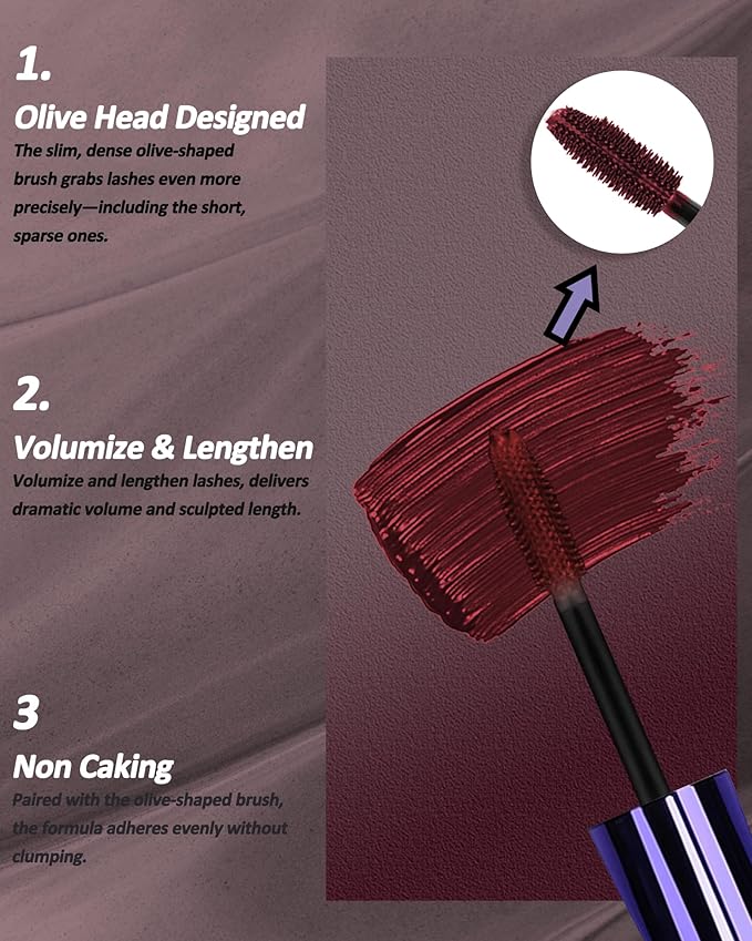 - Mascara's Brush Big Head Design -- Mascara brush head is designed in the shape of an olive, bending to volumize and lengthen lashes, extending every single lash from root to tip.The Red burgundy mascara for eyelashes creates full volume and limitless length, delivering dramatic volume and sculpted length without clumps or globs.