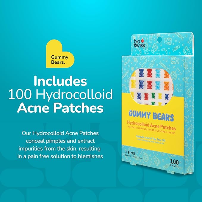 BioSwiss Pimple Patches, Gummy Bears Patch for Zits and Blemishes, Hydrocolloid Spot Stickers for Face and Skin, 100 Count