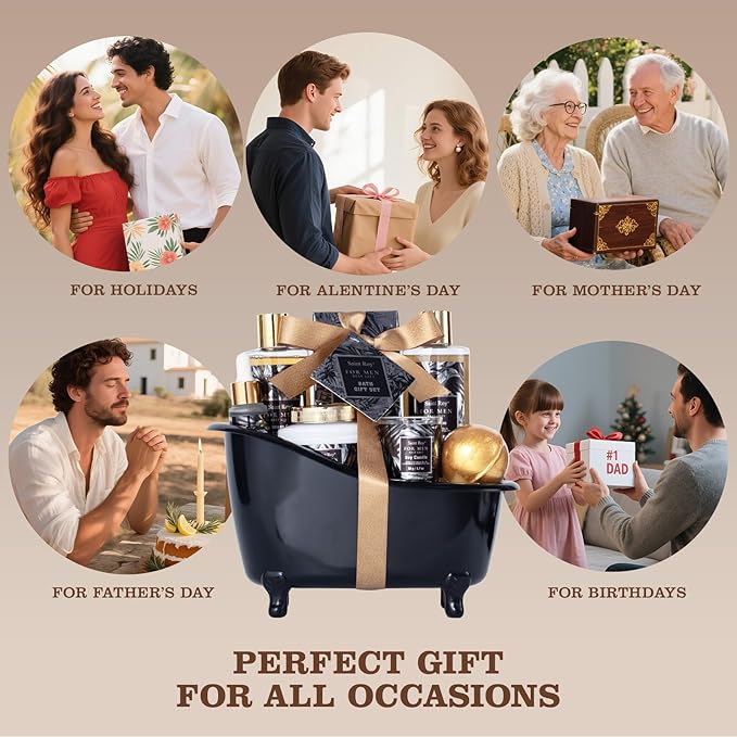 - Birthday Gift Box for Men come with Reusable Basket: Our Luxury Spa Set for Men gift is ready to go as a gift without any additional wrappers needed. And is enough to create an impression on Birthdays, Holidays, Valentine’s Day, Father's Day, Anniversaries, Christmas, and all sorts of occasions. Bring a smile to your Boyfriend, Husband, Father, dad, brother, Son, male friend, grandpa, any other significant man in your life or your Beloved Ones.