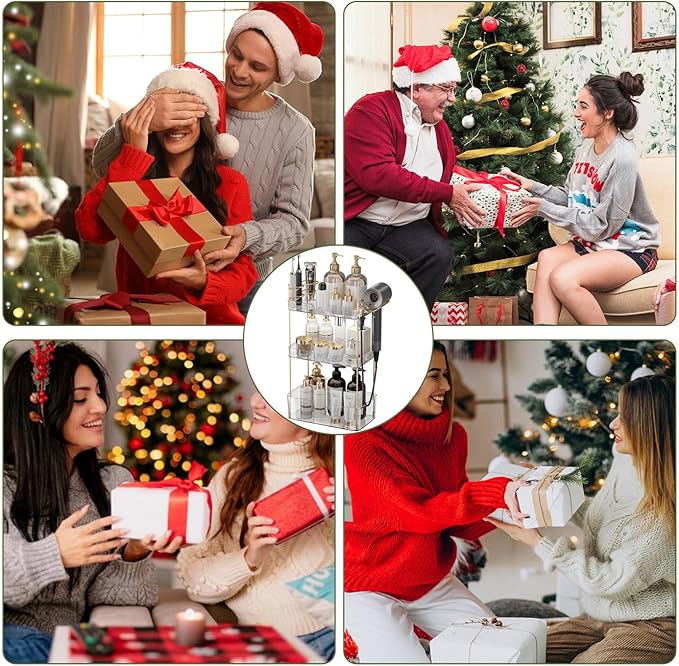 Aveniee Bathroom Counter Organizer,3 Tier Skincare Perfume Countertop Storage with Hair Dryer Rack and Toothbrush Holder, Cosmetic Makeup Tray for Vanity - Gold