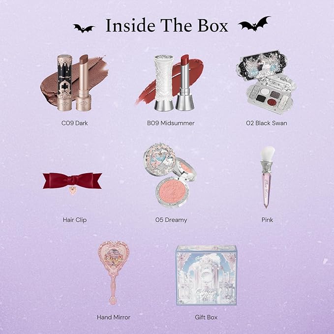 - Luxury 8-Piece Collection: Unleash your inner enchantress with this spellbinding set! Includes 1 Swan Ballet Shine Lipstick (B09), 1 Blush (05), 1 Eyeshadow Palette (02), 1 Little Angel Matte Lipstick (C09), 1 Midsummer Fairytales Hand Mirror (Pink), 1 Blush Brush, 1 hair clip, and 1 premium gift box—everything you need to create a mesmerizing Halloween look or elevate your everyday glam