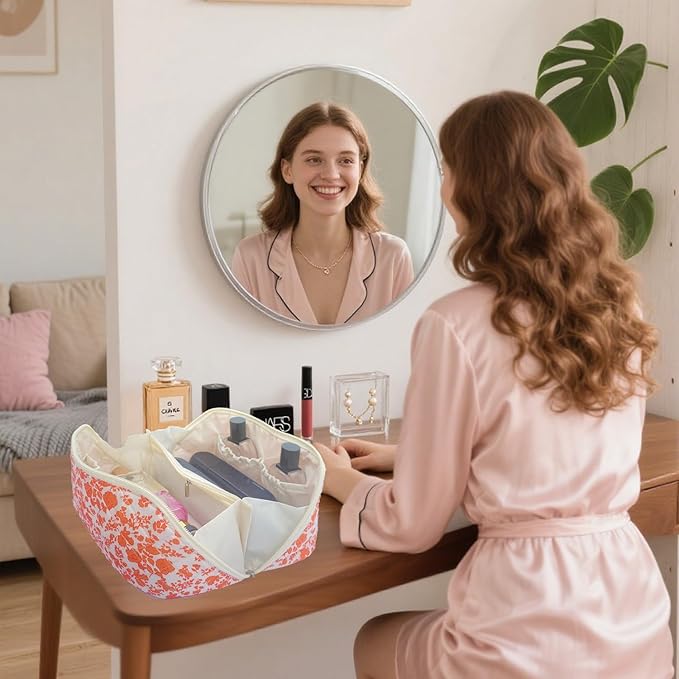 - 【Spacious design】: This quilted makeup bag features a 180° flat design that can be fully unfolded. The spacious open design ensures quick access to all your essentials. It measures 9.4 x 4.7 x 4.7 inches and has multiple inner pockets for organized storage of cosmetics and toiletries.