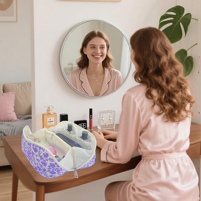 Purple Large Quilted Floral Makeup Bag Cute Coquette Aesthetic Cosmetic Bag Open Flat Travel Toiletry Make up Bag for Women