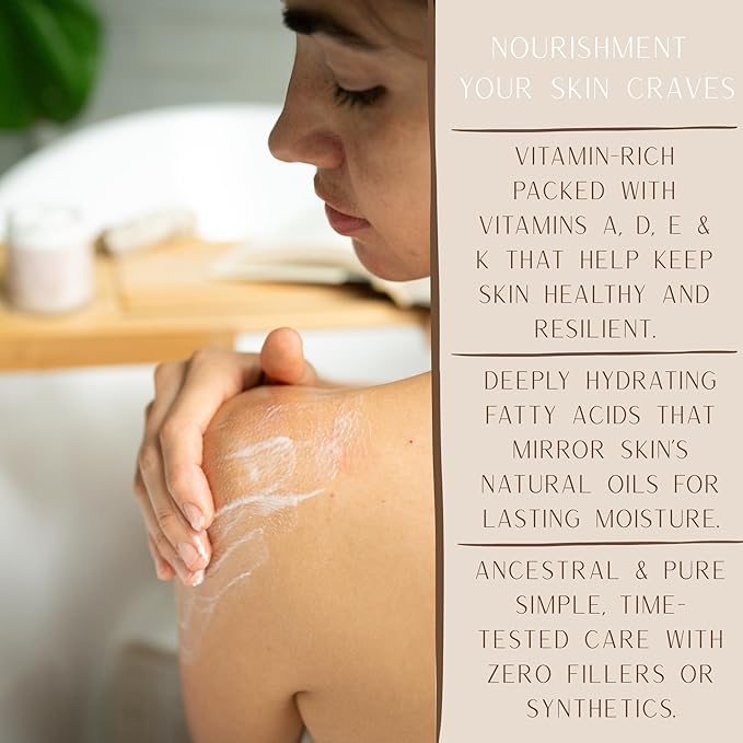 - Rich in Skin-Loving Nutrients: Naturally abundant in vitamins A, D, E & K, tallow deeply nourishes and supports skin repair without fillers or synthetics — leaving skin soft, balanced, and resilient.